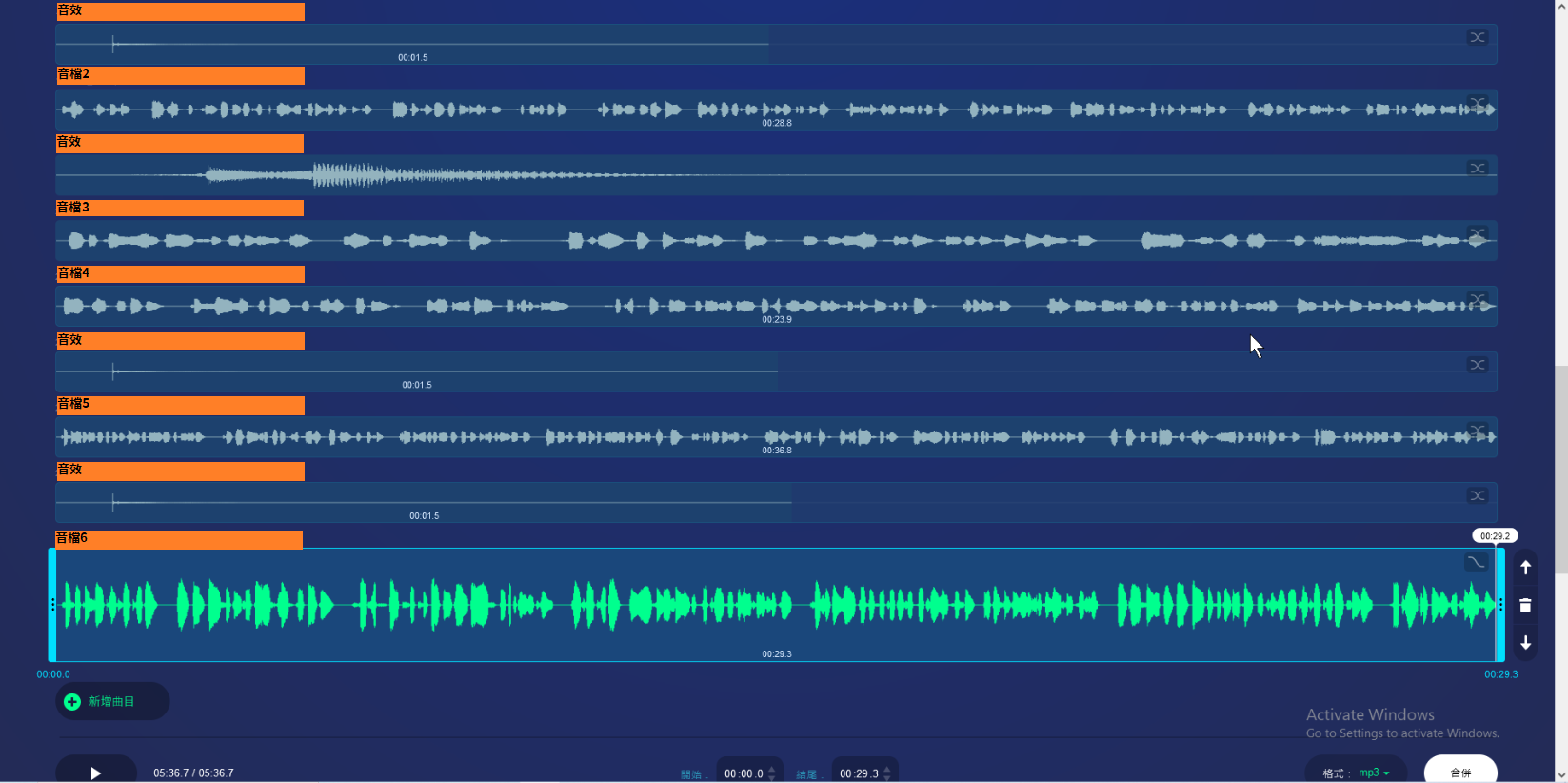2。上傳完畢後一個音檔會變成一個BAR, 可以拖曳調整順序,或是左右調整做切割。
