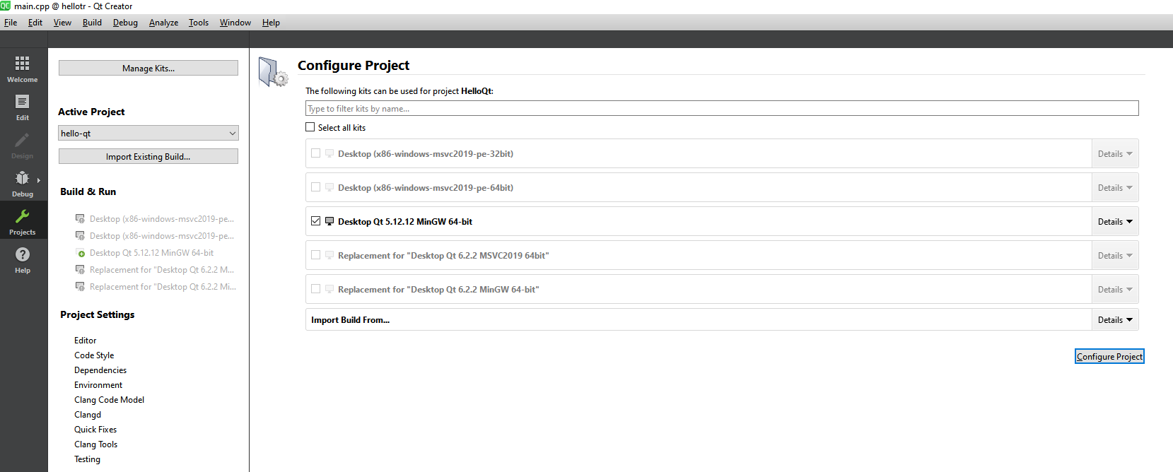6。專案建立的第一步,就是選擇使用的工具 kits,這邊選 Desktop Qt 5.12.12 MingGW 64-bit,最後按 “Configure Project"。這樣就建立好一個 Qt Project 啦。