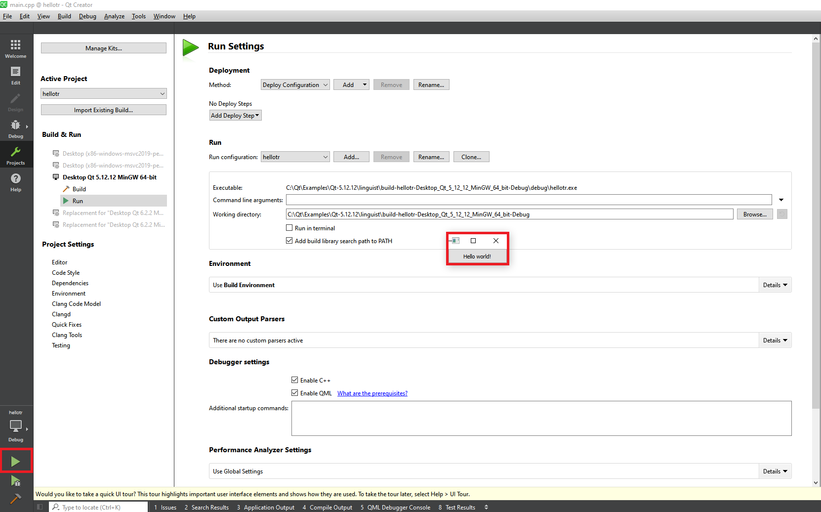 7。再來,如何 Build & Run,按下左邊綠色播放鍵,就可以看到一個 hello world! 小視窗跑出來,表示建置成功!