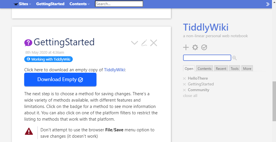 從TiddyWiki官網,找到 GettingStarted,按下"Download Empty"按鈕,下載它的空白檔案,就可以打開,開始編輯。