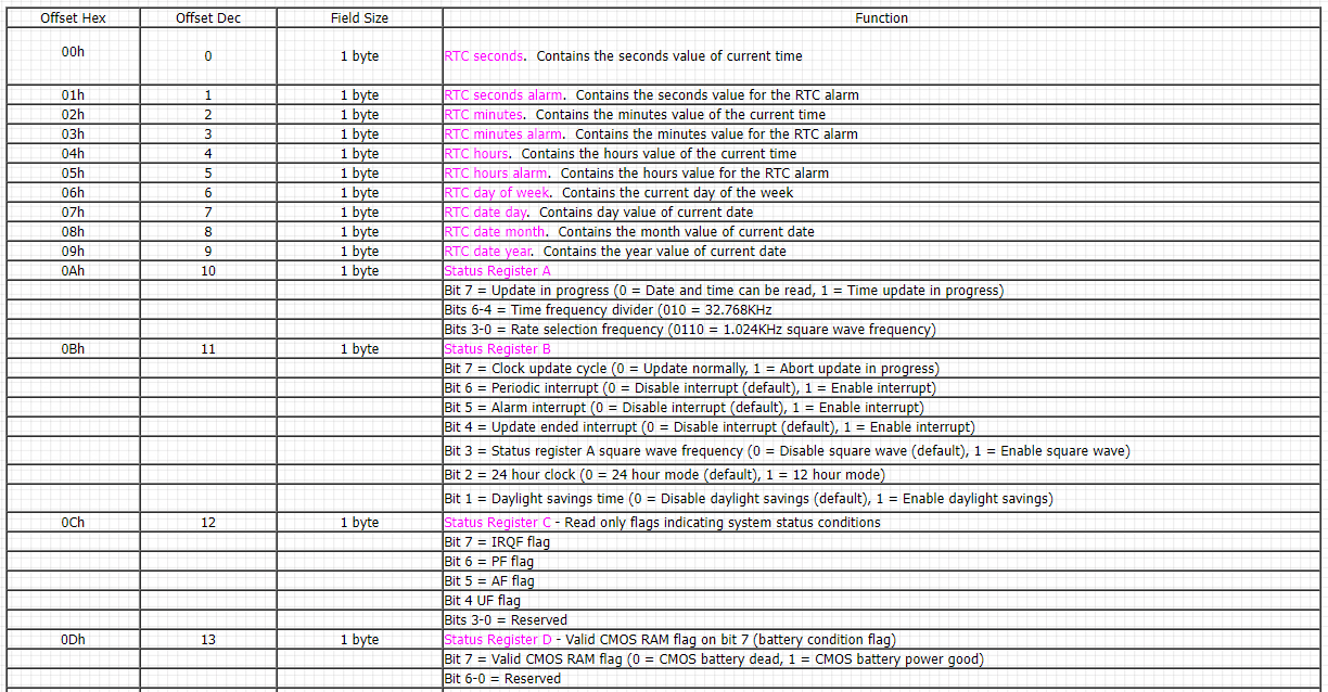 CMOS 內部的資料,其實是有一套標準的配置定義表,簡單以 RTC 為例,系統目前的時間分為世紀、年、月、日、時、分、秒等來分別儲存。這些數值的儲存方式不是使用一般的十進位轉十六進位,而是一種叫做 [4](BCD) 格式的方式來儲存,目的是高度的可讀性可以直接了解目前的系統時間。