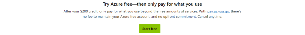 這邊可以看到 Microsoft 的 Azure 不是簡單的服務,其實很多都是按使用量計價。不過為了推廣使用,他還是有開放免費試用,這邊按 “Start free" 進去瞧瞧。