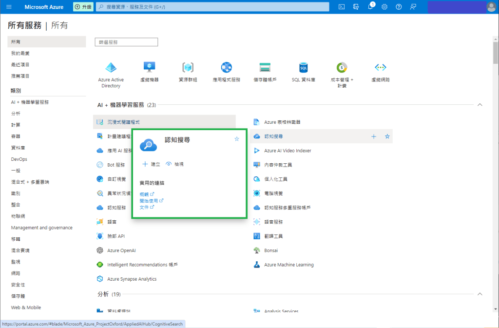 從左邊選單點入 “所有服務" ,就可以看到 Azure 提供哪些東西。尤於服務種類實在太多了,開發的速度比普及的速度還快,所以很多項目有中英混雜的感覺,其實從字面上不太容易理解。