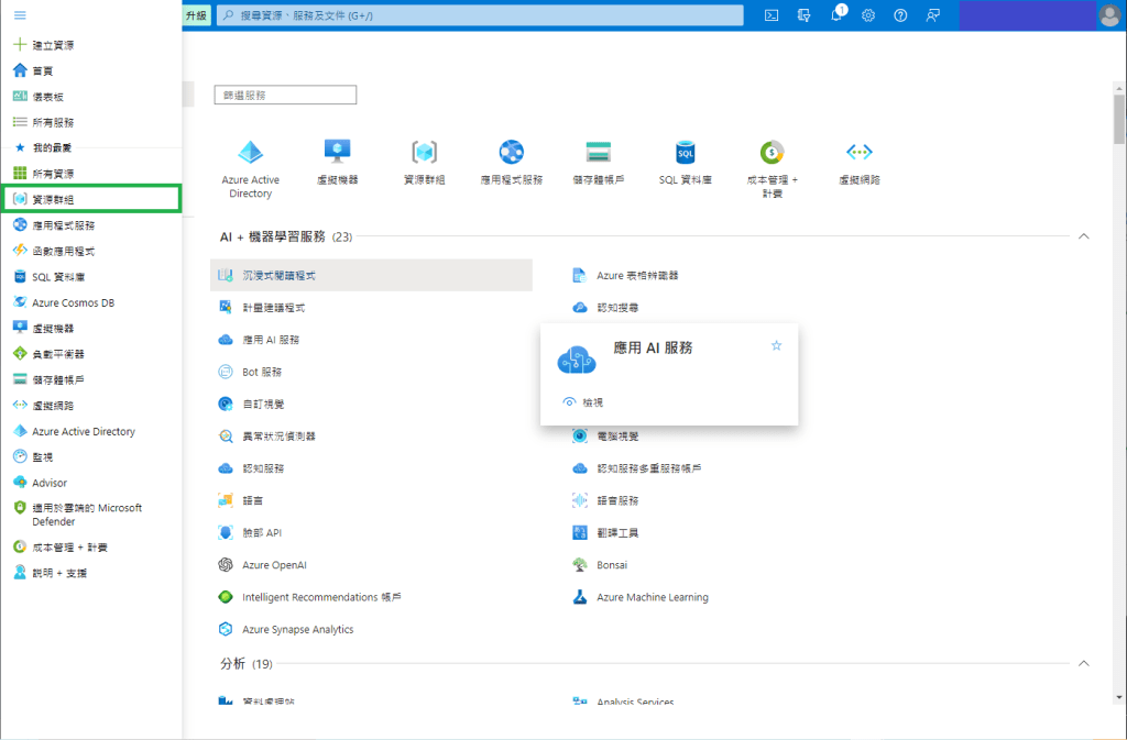 所有始用的 Azure 服務,都必須屬於某個 “資源群組" ,所以第一步從左上角的三條線拉出選單中,點選 “資源群組" 來建立。