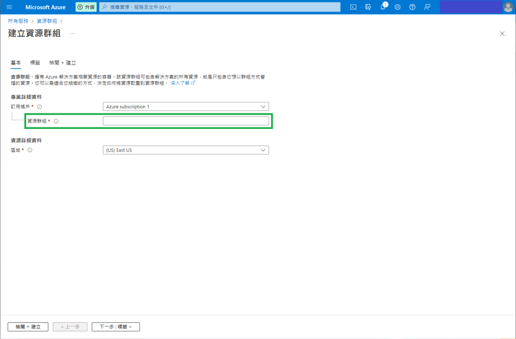 一樣取個名字,按下一步來完成,這邊可以看到,我把它歸至剛剛建立的 REPOxxx 資源群組。