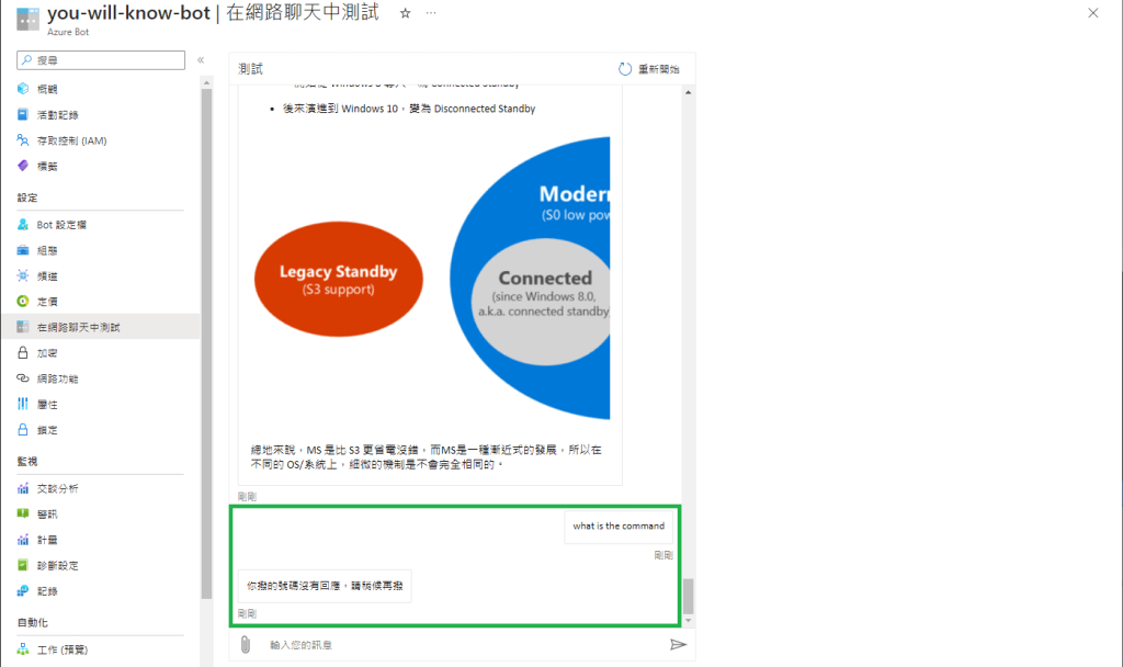 我建立的問答庫是關於 Windows Update / Modern Standby / Markdown 三種資訊,所以接下來進行不同試問: